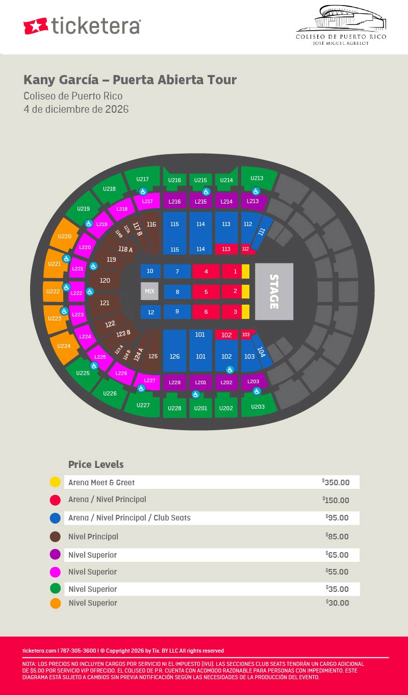 Por política del Coliseo y por su seguridad, se requiere que todo menor de 15 años o menos deben estar acompañados por un adulto mayor de 21 años en todo momento. Esta regla aplica para todos los eventos que se llevan a cabo en el Coliseo de Puerto Rico.